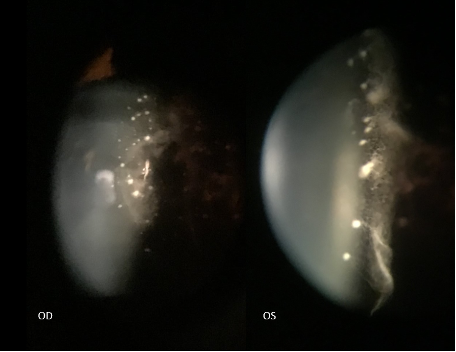 Slit lamp photography of both eyes showing the posterior lenticular deposits with glass wool-like vitreous opacities in the anterior vitreous.