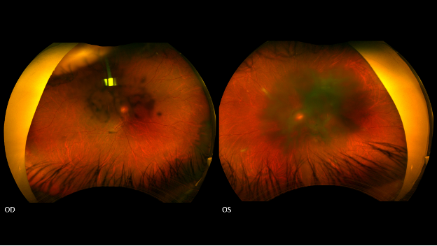 Fundus photography of both eyes showing media opacity in both eyes.