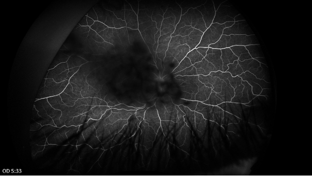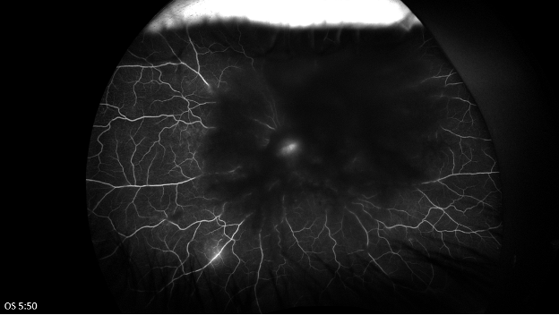 Late phase fluorescein angiography of both eyes shows central blockage in both eyes from lenticular and vitreous opacities. In the left eye there is possible leakage from the optic disc and late venous leakage inferiorly.