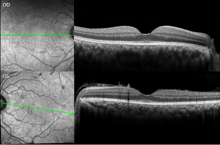 Optical coherence tomography of macula of both eyes. The left eye reveals needle-shaped deposits on the anterior retinal surface extending into the vitreous.