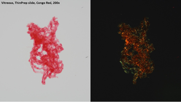 - Congo red staining of a vitreous sample may reveal the protein deposits with apple green birefringence.