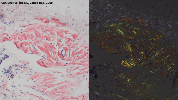 Pathology slides of the vitreous and conjunctiva with Congo red stain demonstrating apple-green birefringence, consistent with amyloid deposit.