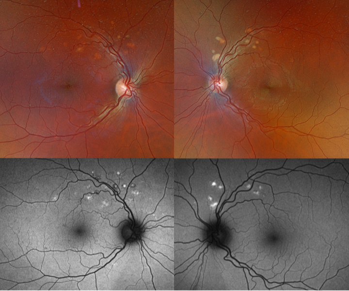 A 36-year-old man referred for abnormal fundus findings seen on routine eye exam. Visual acuity is 20/20 bilaterally and he is asymptomatic. The fundus images and autofluorescence findings are presented below. What is the diagnosis?